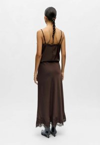 Barna szatén maxi szoknya csipkés szegéllyel. Fekete, hegyes orrú bokacsizmával párosítva. Sima textúra és testhezálló sziluett.