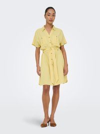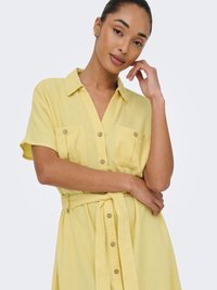 Nő áll, rövid ujjú, sárga gombos ruhát visel, elülső zsebekkel és megkötött derékövvel, egyszínű világos háttér előtt.