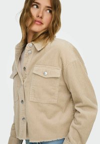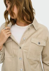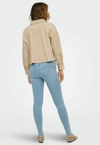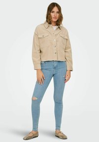 Nő, aki bézs színű kordbársony rövidített dzsekit visel ezüstszínű gombokkal és világoskék, szakadt szűk farmernadrággal, miközben a gallér közelében tartja a kezét.