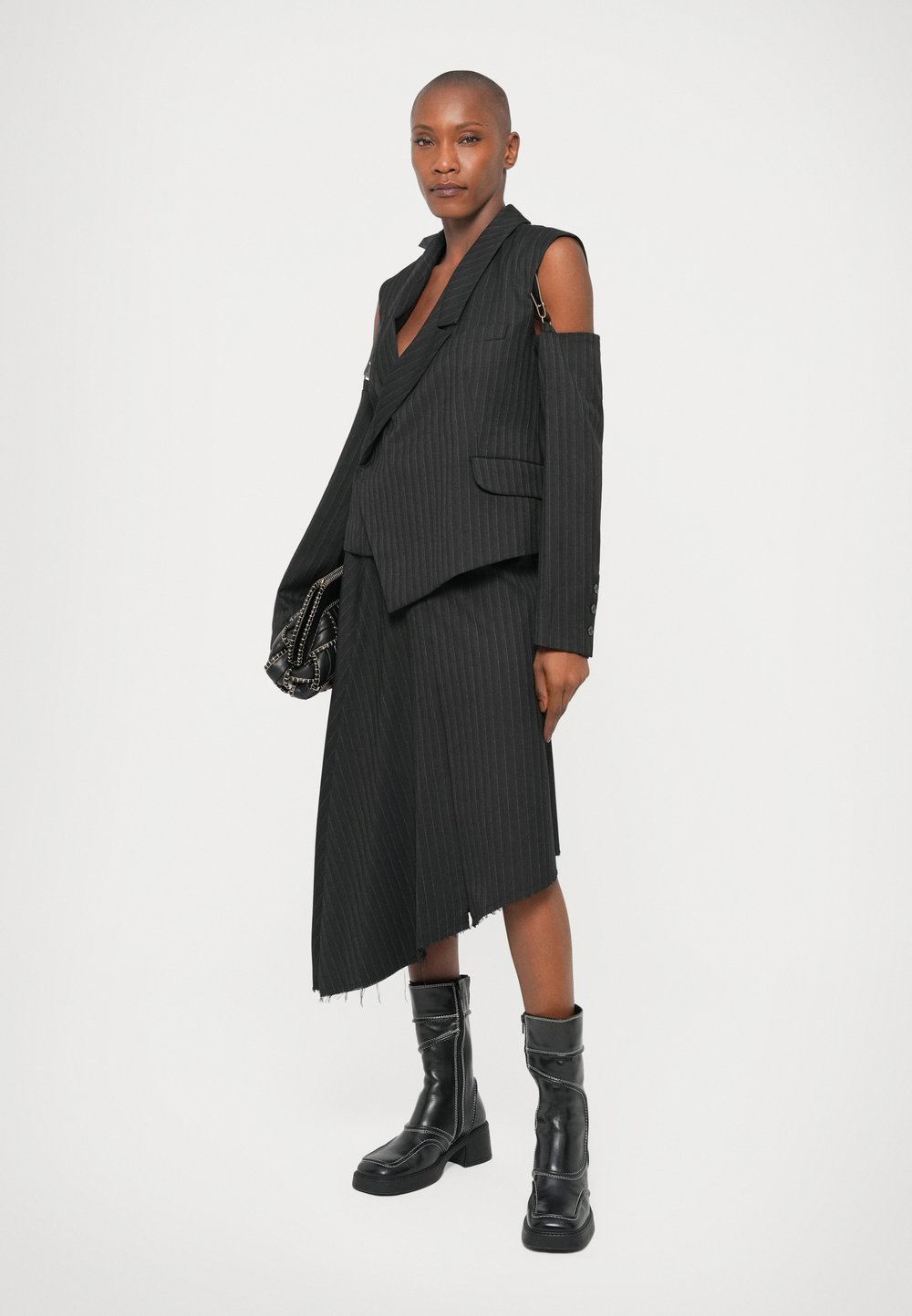 Fekete oversize blézer sima textúrával, egy mély V-kivágású felső és egy laza fekete szoknya fölött; egy kis gyöngyökkel díszített táskát tart a kezében.