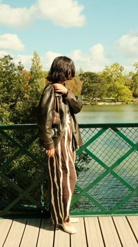 • Barna bőrkabát fehér felső fölött, széles csíkozású barna és fehér nadrággal párosítva. Fehér lapos cipők és kis táska. Fa terasz és zöld korlát.