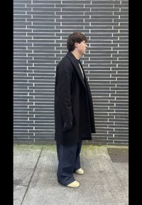 • Fiatal férfi fekete kabátban és kesztyűben igazít egy kesztyűt, széles sötét farmert és világos cipőt visel, egy fekete-fehér téglafal előtt áll.