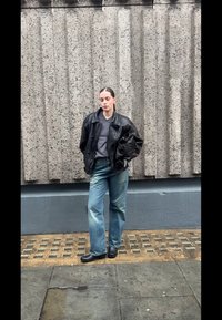 • Fekete bőrkabát és kesztyű viselve egy személy által, aki egy fekete, összegyűrt táskát tart, kék farmernadrággal párosítva. A háttér textúrált.