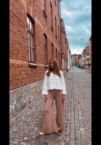 Egy modellt láthatunk, aki világos bézs felsőt és széles fehér lennadrágot visel, barna sállal, és egy macskaköves utcán áll, textúrált szürke falak közelében.
