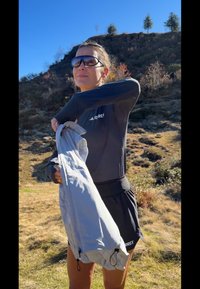 • Nő a hegyvidéki tájban, aki kabátot húz magára, fekete sportnadrágot és hosszú ujjú pólót visel, a napszemüvege a fején van.