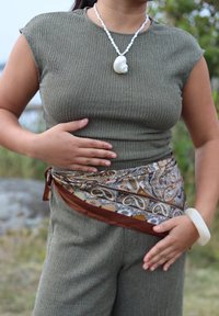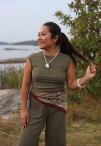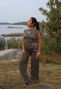Barna vászon cropped top, bézs bő szárú nadrág és barna espadrille szandál. A háttérben fa redőnyök és kültéri ülőhelyek láthatók.
