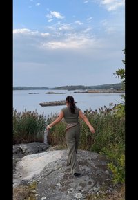 Beige vászon, oversized dzseki két nagy gombbal, világos színű, cropped nadrággal és sötét lábbelivel párosítva. Kültéri környezet zöld növényzet mellett.