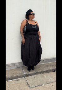 • Fekete ujjatlan felső "Sex" grafikával, fekete, lágyan lebegő szoknya, fekete harisnya és hegyes orrú magassarkú cipő. Kiegészítők közé tartozik a nagy napszemüveg és egy sapka.