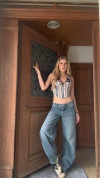 • Csíkos, rövidített felső fekete gallérral, laza szabású, kifakult kék farmerral párosítva. A háttérben faajtók és mintás fém látható.