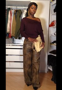 Fekete ujjatlan felső, oversize barna mintás nadrág, egy kis barna táskával a kezében. A háttérben különféle ruhadarabok és cipők egy szekrényben.