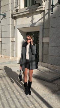 • Nő sétál a szabadban, szürke kabátot visel szőrme gallérral, fekete szoknyát, fekete csizmát, napszemüveget, és fekete táskát hord a napfényben.