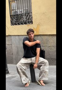 • Világos színű terepmintás cargó nadrág oldalzsebekkel, fekete polóinggel és papuccsal, egy járdán ülve.