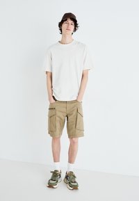 Fekete V nyakú póló, bézs cargo sort nagy zsebekkel, fekete klumpák. Világos háttér finom árnyékokkal. Minimalista városi környezet.