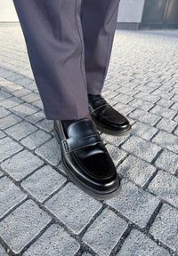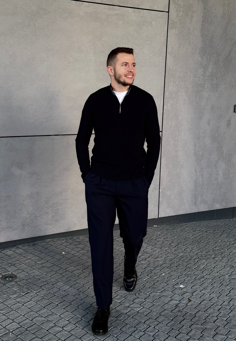 Férfi járködik csempézett járdán fekete dzsekit, fehér inget, fekete nadrágot és barna mokaszint viselve, mosolyogva, oldalra nézve.