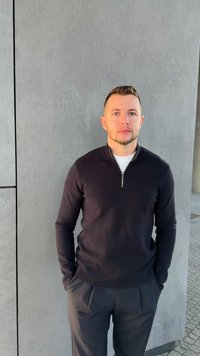 Fiatal férfi mosolyogva, csempézett talajon sétál, barna dzsekit, bézs pulóvert, fekete nadrágot és fekete cipőt visel szürke fal előtt.