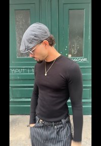 Beige bordázott hosszú ujjas henley póló gombos kivágással, fekete bő szárú nadrággal párosítva. Szürke lapos sapka és fekete cipő egészíti ki a megjelenést.