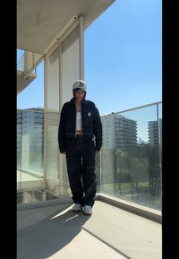 • Fekete csíkos farmerdzseki és nadrág fehér varrással; fehér sportcipővel és szürke sapkával párosítva, egy erkélyen állva.