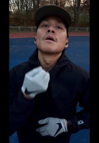 • Fekete dzseki és fekete nadrág; szürke sportkesztyűk logóval. Egy személy békejelet mutat egy kék pályán, háttérben zöld fű és fák.