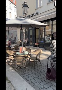 • Csíkos fekete és fehér ruha fekete kendővel. Egy bordó kézitáska és egy kávéscsésze egy üveg asztalon egy szabadtéri kávézóban.