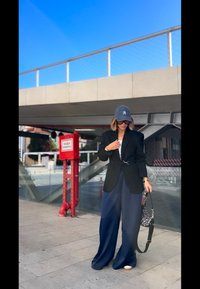 • Egy nő fekete blézert, fehér felsőt, széles, sötétkék, fehér csíkos sportnadrágot, sportcipőt és kék sapkát visel, miközben egy fekete táska van nála a szabadban.