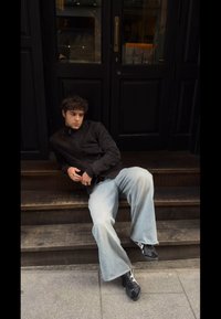 • Fekete cipzáras dzseki, laza, világoskék, enyhén bővülő szárú farmer, és fekete sportcipő. Egy sötét ajtó előtt, fából készült lépcsőkön ül.