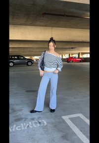 Fekete aszimmetrikus top vékony pántokkal, kék csíkos széles lábú nadrág, fekete szőtt magassarkú cipő, piros hálós táska, beltéri környezet növényekkel.