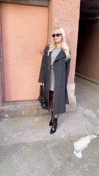 • Fekete gyapjúkabát, szürke pulóver, pliszírozott szürke szoknya, fekete bokacsizma, fekete kézitáska és napszemüveg; divatos, réteges outfit.