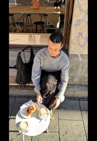 • Szürke pulóver, fekete laza nadrág, bézs slip-on cipők fehér zoknival. Kávéscsészét tart latte művészettel. Fekete frufrus táska a közelben. Tányéron péksütemény.