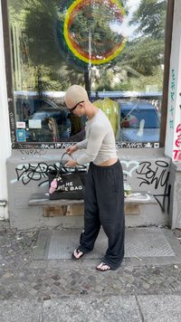• Fekete vászontáska fehér felirattal, szürke hosszú ujjú póló, fekete nadrág és papucs. Három zöld ital egy tálcán. Graffiti a háttérben.
