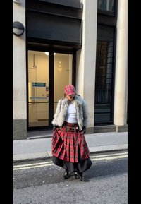 • Piros kockás szoknya redőkkel, fekete alsószoknyával, műszőrme kabáttal, fekete kesztyűvel és hozzáillő piros kockás sapkával. Városi utcai háttér.