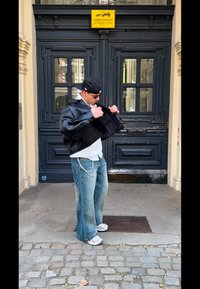 • Fekete, cropped bőrkabát, szürke pulóver, túlméretes világoskék farmernadrág, fehér sportcipő szürke részletekkel, ezüst lánc díszítéssel. Összesen négy látható réteg.