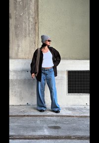• Barna oversize dzseki, fehér ujjatlan felső, világoskék trapéz nadrág, szürke sapka és fekete cipő. Szürke válltáskát hord. Texturált fal háttér.