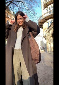 • Egy nő hosszú, sötétbarna kabátot visel széles ujjakkal, világosszürke pulóver fölött és csíkos szürke nadrágot, miközben egy barna, steppelt táskát hord.