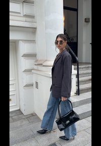 • Fekete kézitáska dupla fogantyúval, sötét blézerrrel és széles szárú kék farmernadrággal viselve. A háttérben egy fehér épület és szürke kőlépcsők láthatók.