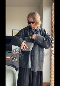 • Fekete bőr oversized dzseki gombos záródással, fekete ruhával párosítva. Kiegészítők között szerepel egy csíkos keresztbody táska és napszemüveg.