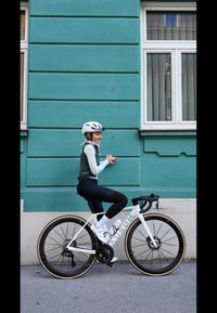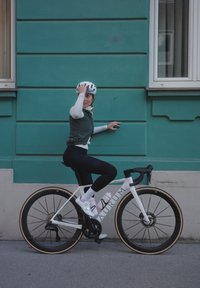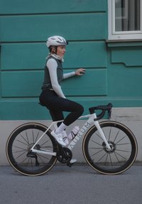 Sportoló lila ujjatlan felsőben, fehér hosszú ujjú póló fölött, fekete kerékpáros rövidnadrágban, fehér térdhosszú zoknival és rózsaszín futócipővel.