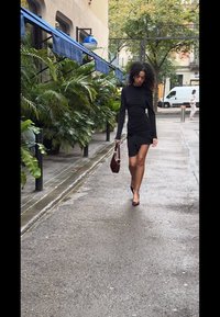 • Fekete hosszú ujjú ruha fodrokkal és oldalsó csomós részlettel, bordó lakkbőr magas sarkú cipővel és hozzáillő kézitáskával, utcán sétálva.