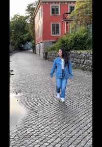 Barna, oversized dzseki fehér réteges ruhával, kövezet melletti állásban. Zöld növények és kültéri ülőhelyek a háttérben.