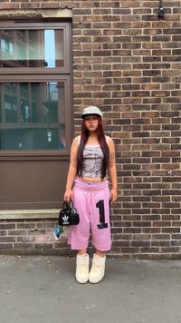 • Rózsaszín sportos rövidnadrág fekete "10"-es számmal, szürke crop top, fehér csizmák és fekete Adidas logós kézitáska; egy téglafal előtt áll.