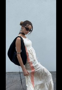 • Fehér ujjatlan felső vékony pántokkal, krémszínű, fodros szegélyű ruha, fekete pántokkal, és nagy ezüst karika fülbevalókkal. Fekete táska a kezében.