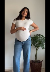 Terhes nő mosolyog bent, bézs hosszú ujjú felsőt, kék farmert és fekete magas sarkút visel, kezében sötétbarna kézitáska, egy cserepes növény mellett áll.