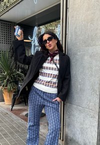 Kék mintás dzseki piros motívumokkal, kék felső, és világos farmer széles szárú nadrág. Kerek bézs cipők. Egy mintás üvegajtó mellett áll.