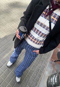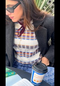 Túlméretezett csíkos pulóver piros és tengerészkék színben, grafikus szöveggel. Világoskék farmerrel és fekete fonott táskával párosítva. Rövid haj; nagy napszemüveg.