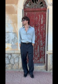• Világoskék, felgörgőtt ujjú ing, fekete nadrág és fekete cipő társaságában, egy megkopott piros ajtó és egy texturált kőfal előtt áll.