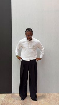 • Egy személy áll egy tükrözött térben, fehér hosszú ujjú inget visel, melyen apró minta látható, valamint széles fekete nadrágot, előtérben egy növénnyel.