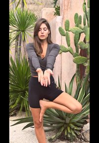 • Sötét szürke, deréknál megkötött blúz, fekete sportnadrág, nő jógapózban zöld növények között és egy textúrált rózsaszín fal háttér előtt.