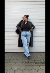 • Csíkos hosszú kabát műszőrme díszítéssel, fekete body, világoskék bővebb szabású farmernadrág és vastag fekete platform cipők. Nagyméretű kerek napszemüveg.