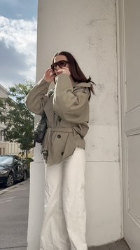• Napszemüveget viselő nő bézs kabátban, csíkos pólóban és fehér, széles nadrágban áll egy utcán, mögötte parkoló autókkal és egy sárga épülettel.