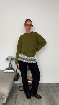 • Olajzöld kötött pulóver, alatta fehér csipke díszítés, fekete nadrág, fekete cipő és sárgás árnyalatú napszemüveg. Modern stílus, rétegezett textúrákkal.