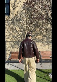 • Barna bőrkabát bézs pulóver felett, szürke, bő nadrág, és bézs tornacipő fekete csíkokkal. Egy bordó táskát tart, miközben a vörös ajtó közelében sétál.